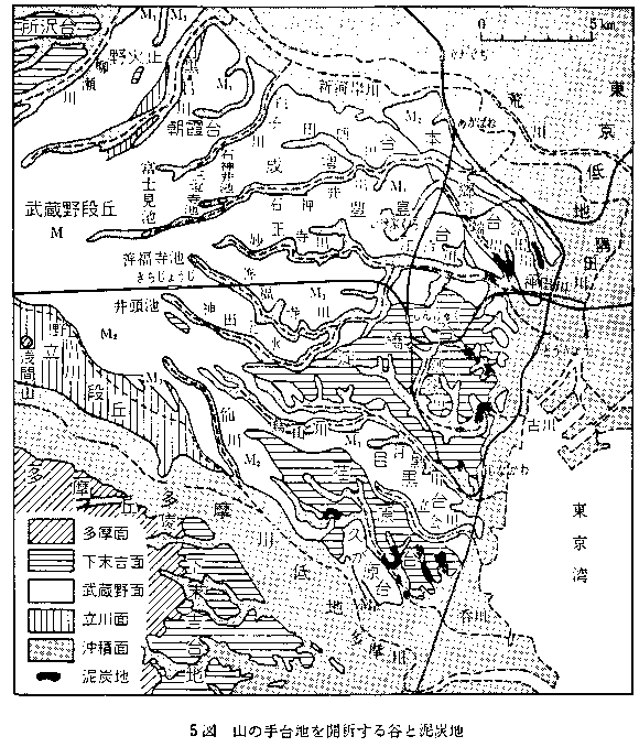 武蔵野台地は1)多摩川の河岸段丘2)台地と低地の2段構造、という性格を持っている。さらに、表層の地質は関東ロームに覆われていて、そのロームの区分と段丘の分類が対応している。