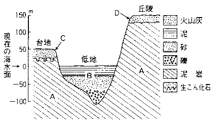 図1は、ある海岸に近い地域の地形と地質の断面図である。A層は傾斜した泥岩層で、この地域の基盤を形成している。 B層は低地に堆積し、下部はレキ層、中部・上部はそれぞれ砂層・泥層からなり、泥層からカキの貝殻の化石を産出する。 C層は台地を構成する砂層で、アサリの化石を産出し、その基底部には生痕化石(穿孔性の二枚貝の巣穴化石)が見られる。 D層は降下火山灰層で、丘陵を覆っている。
