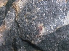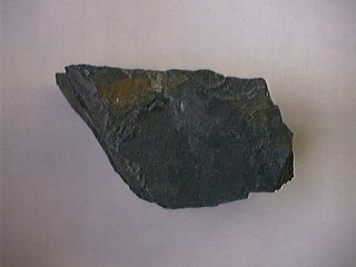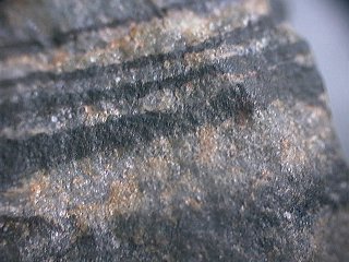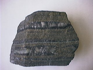南アフリカ・バーバートン地域 Fig Tree Formationの縞状鉄鉱。約32億年前。金色に光るのは黄鉄鉱。有機炭素が多く、黒っぽい見かけをする。 標本:今井 亮氏提供 *縞状鉄鉱から何がわかるか