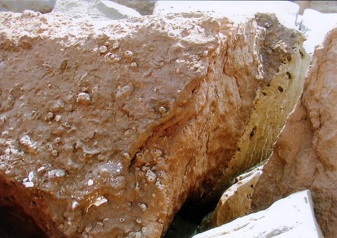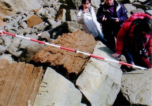 海食崖の不整合部分にはとりつけないが、崖から落下した転石で、その不整合面の境界を観察できる。凝灰質シルト岩に穿孔貝の生痕があり、それを覆って砂の層が堆積しているのがわかる。さらに50cmほど上位に貝化石の密集層があり、その周辺にはサンドパイプ様の生痕化石も多い。