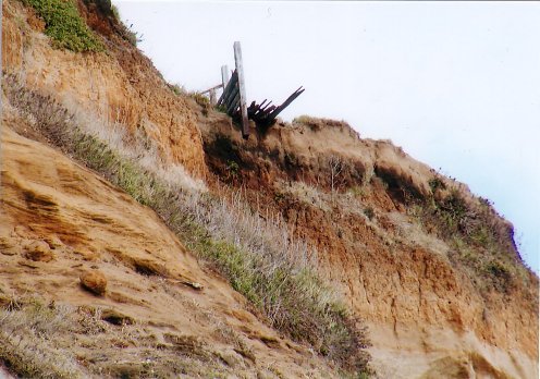 海食崖上部には、斜交層理が顕著な海成砂層が不整合でのり、さらに陸成のローム層へと移行する。ロームの平均堆積速度から逆算すると、おそらく約12万年前の高海面期(下末吉海進)以降、陸化してロームが堆積したものと推定できる。