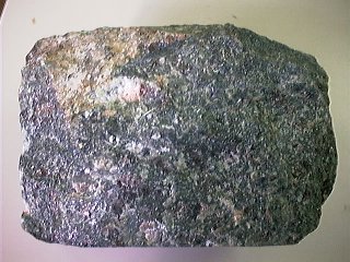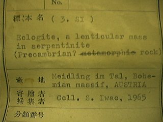 注)ごめんなさい。ドイツの方から指摘があり、この標本は変成岩のeclogiteではなく、一種の火成岩であるgarnet pyroxeneiteであるらしい。採集当時はeclogiteと言われていたようですが。