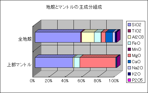 グラフに表された主成分元素の各成分をみると、マントルでは多いMgOが地殻では大幅に減少し、 FeOはほぼ同じ、その他の元素では地殻の方が増加している。特にAl2O3やCaOは大幅に増加している。