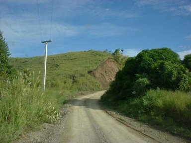 Sigatoka川下流域の丘陵、尾根道の切り割り。第三紀末から第四紀と推定される段丘堆積物が尾根部に見られる。