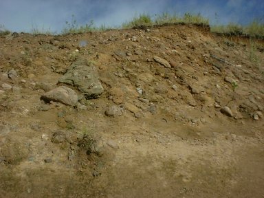 河川成堆積物の巨礫が露出している。尾根に巨礫が見られるというのは、現在の地形から考えると異常なことで、河川流域一帯が隆起したことと、巨礫の堆積時に、かなり起伏の激しい地形があったことを示している。
