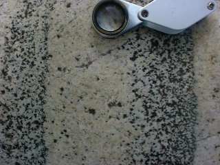 上の写真でルーペを置いた付近の拡大。ひとつの堆積サイクルを示す。黒雲母が右側に集まっていて、
