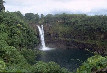 海食崖。ハワイ島の北東部は北東貿易風の風上で、山の斜面を吹き上る湿った風によって雲が生まれ、降水量が多い。ハワイ島は東西で熱帯雨林〜砂漠と、極端な気候の差がある。