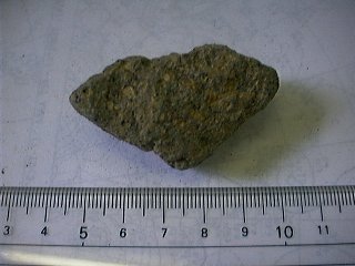 変質・風化した安山岩andesite。斜長石plagioclase、普通輝石augiteなどの斑晶がわかる。火山岩の肉眼鑑定は、斑晶鉱物が決めて。標準的には、玄武岩:かんらん石+斜長石、安山岩:斜長石+普通輝石(+しそ輝石hypersthene、角閃石hornblende)、流紋岩rhyolite:斜長石+石英quartz+黒雲母biotite(+角閃石)