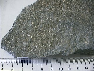 斑晶がたくさん見えるので、火山岩であることがわかる。白い点々が斜長石斑晶