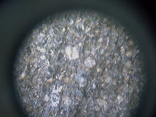 中央付近の白く目立つのが、斜長石の斑晶。黒い粒が輝石だが、写真でずんぐりしたもの(普通輝石)と、細長いもの(しそ輝石)の区別がつくだろうか。