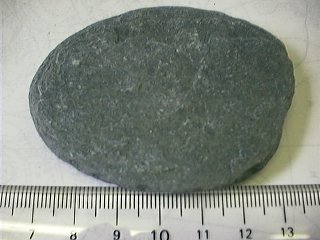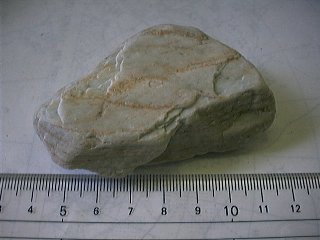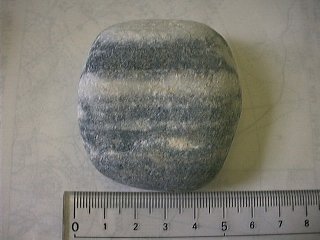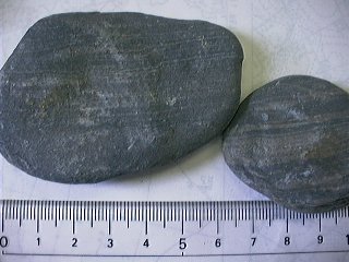 粘板岩slate。薄い砂泥互層が弱い変成作用を受けている。層理面ではなく、スレート劈開(へきかい)の方向に割れるので、このような砂と泥の縞模様のよくわかるレキができる。