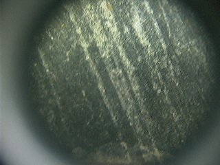 拡大したもの。斜長石の多い部分と角閃石の多い部分が、色の濃淡の縞をつくっている。