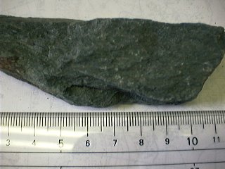 緑色片岩というのは立派な分類名で、緑泥石、緑簾(りょくれん)石、アクチノライト(透緑閃石)、斜長石などの鉱物組み合わせを特徴とする、玄武岩〜安山岩の化学組成を持つ、変成岩の総称。地下5〜20km、300〜400度の条件を示す。