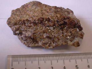 石灰岩と花崗岩マグマとの接触部に発達する、接触交代鉱床に特徴的な、 スカルンと呼ばれる岩石。この場合はベスブ石がほとんどで、ベスブ石スカルンと呼ぶ。 かつて秩父鉱山では、スカルンに伴う銅・亜鉛・鉛などの鉱物を採掘していた。
