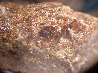 その拡大。視野の幅2cm。ベスブ石の大きな短柱状結晶。