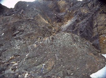 イスア地域の38億年前の地層の最下部とされる、角閃片岩(A1)とアミツォク片麻岩の境界の露頭。 両者は不連続であり、片麻岩の縞状構造が境界と斜交しているのがわかる。不整合の証拠は見つからなかった。この50mほど南側には境界に平行な構造方向を持つマイロナイトが見られる