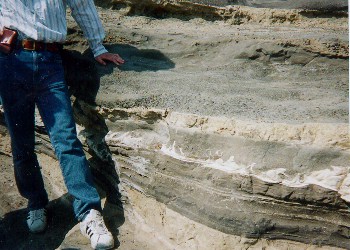 生痕化石(画面やや左上からの白い点々)と層内での変形(右側の白い地層の角礫化)。
