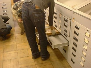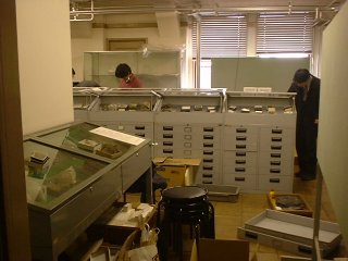 常設展示に向けて、標本を展示ケースに仮配置しました。(2000.3.31)