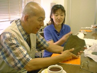 スタジオで使う三葉虫(バージェス頁岩)を手にして楽しそうな濱田先生。 この標本は、かつて「地球大紀行展」に展示されたもの。奥は第9回担当のPD鈴木知子さん。 アノマロカリスの化石。東北大資料館からお借りしたもの。 標本を見て、「気持ち悪ーい」。 VTR部分を説明する鈴木さん。 箕輪さん。 SD石倉さん(左)と谷中さん(右)。
