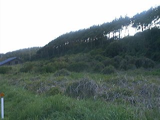 海岸段丘。一列に並ぶ松の向こうには平坦面が広がっている。下末吉面相当?。