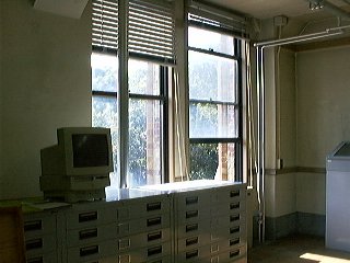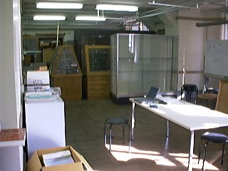 内部の様子。ここで分類や整理の作業をしています。奥に見えるのは標本ケース類。登録の完了していない標本が詰まっています。