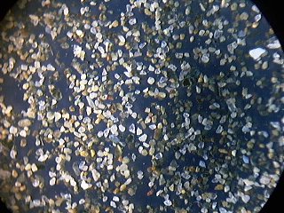 多摩川の河原の砂。宿河原堰下流の狛江市猪方にて採集。奥多摩の地質を反映して、堆積岩の岩片が目立つ。チャート片、石英脈の破片も多い。火山岩の破片や、斑晶と思われる輝石の破片もある。その他、石英、黒雲母、斜長石などの鉱物片、磁鉄鉱など。