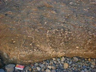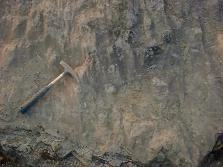 拝島橋下流の多摩川河床にて。上総層群のサンドパイプ。更新世初期。2000.2