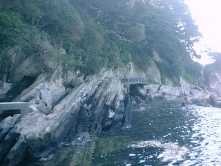安房崎北側。コンクリートの橋を境に、傾斜が異なるのがわかる。