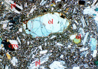 クロスニコルの写真。中央の鮮やかな干渉色を示すのが、かんらん石。丸っこい外形と、不規則な割れ口(ひびが曲線)、スピネルの包有物、直消光、表面のなめらかな感じが特徴。やや細長い鮮やかな干渉色を示すのが普通輝石augite。細長い外形と2方向の劈開、双晶、斜消光、弱い多色性が特徴。そのほか、斜長石の斑晶が多数ある。