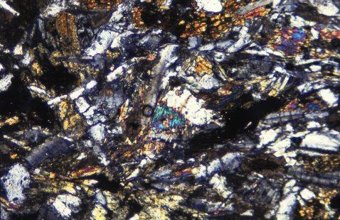 画面中央に、斜長石にはさまれた三角形の領域に、角閃石が青い干渉色を示している。原岩の火成岩(玄武岩質熔岩)の、斜長石の結晶間を普通輝石が埋める、オフィティック組織の特徴が残っている。岩石は枕状熔岩−角れき岩の構造を残す緑廉石角閃岩。