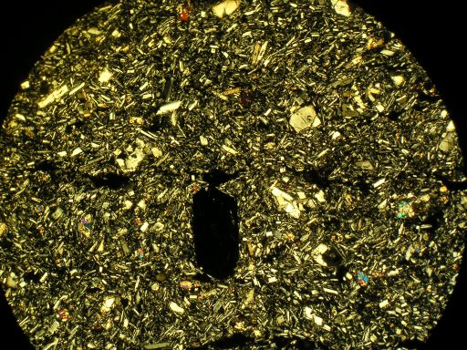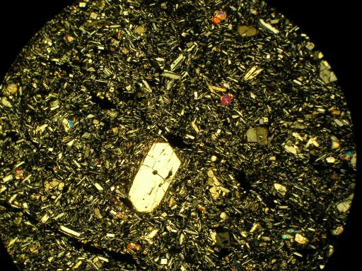かんらん石斑晶。捕獲結晶ではなく、マグマ本来の斑晶。石基は斜長石、かんらん石の微斑晶、bronzite(古銅輝石)、鉄鉱物…。