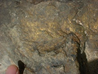 八茎鉱山で採掘していたスカルン中の銅鉱の産状。この岩石全体は灰鉄輝石スカルン。