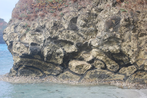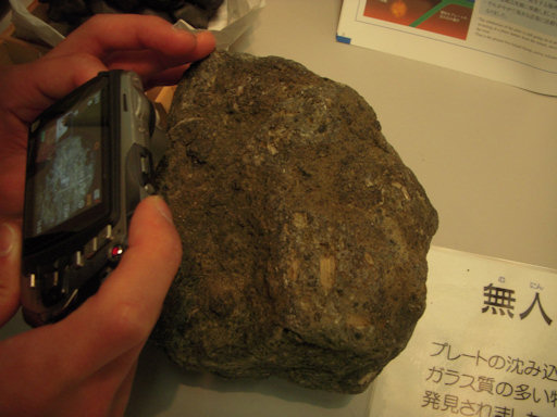 ビジターセンターにて。ボニナイト標本。白いのが単斜エンスタタイト。