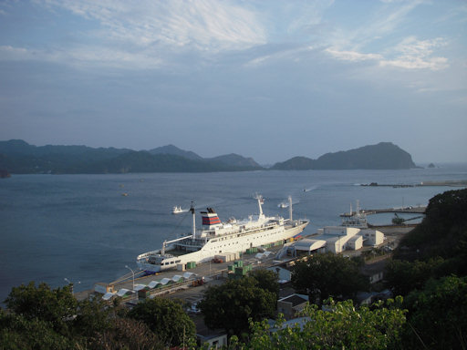 二見港と停泊中のおがさわら丸。我々の宿でもある。