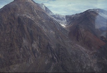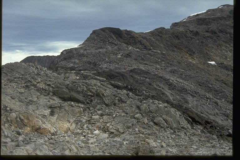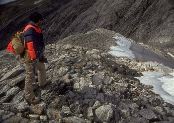 高度1000mの峠。尾根の北側に張り付く万年雪が山岳氷河の始まり。白い岩石は斜長岩。