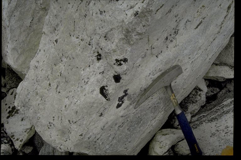 斜長岩(手前、白い岩石)とMalene表成岩の変成堆積岩との境界。おそらく断層境界。これより2km東方(見かけ上位)では変成komatiiteも報告されている。