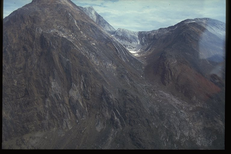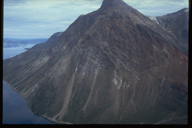 海面から一気に1400mのピークまでの絶壁に、約28億年前のMalene表成岩と斜長岩複合岩体の断面が露出している。