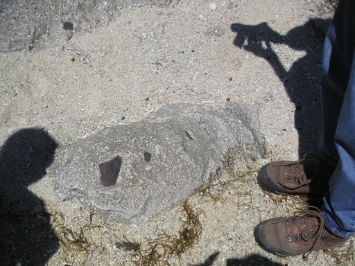 割れてひっくり返ったビーチロックの裏側。光が当たらないところには藻類?が生えていない。貝殻片が見えて、石灰質の砂が固まったことがわかる。