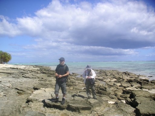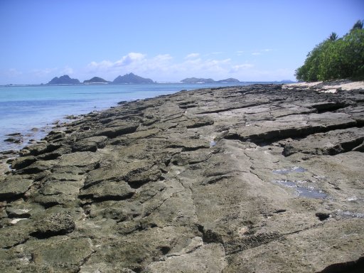 マナ島ノースビーチにて。従業員村の前の海岸で、ビーチロック中に煉瓦片のような人工物がとりこまれているのがわかる。非常に速い速度で形成されている証拠。