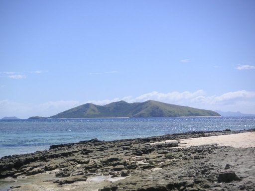 フィジー諸島ママヌザ諸島・マナ島サンセットビーチのビーチロック。厚さ20cmほどの石灰質粗粒砂岩の層が海岸を覆うかたちになっている。島を作る地層本体ではなく現世の堆積物である。
