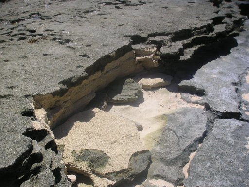 熱帯・亜熱帯の海岸では、砂やレキのすきまに炭酸カルシウムが沈殿し、非常に急速に岩石の固結が進むことがあります。このようにしてできた岩石をビーチロックといいます。