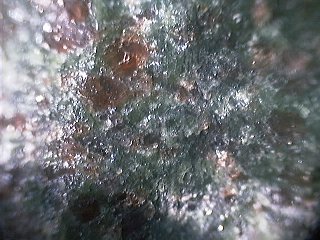 拡大写真。画面の大半を占める、淡緑色の鉱物がオンファス輝石(ひすい輝石成分に富む輝石固溶体)。淡紅色の丸っこい鉱物が、パイロープ(Mgに富むざくろ石)。地下30kmより深い圧力条件で安定な鉱物の組み合わせ。