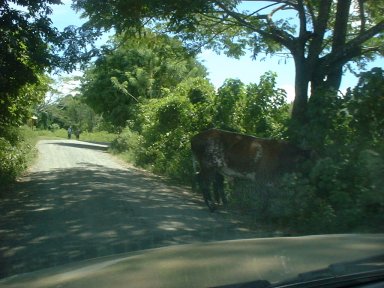 道をあける牛。放し飼いに近い状態で飼われている牛が道をふさいでいることも多いが、性質はおとなしく、たいがいは道をあけてくれる。
