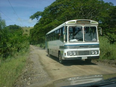 電気の通じていない、かなり内陸の地域にも、バスは運行している。このバスは窓があるが、窓のないバスも多い。