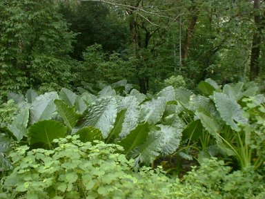 タロイモの畑。雨が降るとほかの植物は葉を垂れるのに、芋だけは生き生きと巨大な葉を天にのばしている。