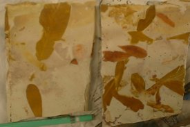オーストラリア産のグロッソプテリスの化石。ペルム紀。幅広の葉が特徴。 裸子植物なので、種子も化石に見られる。