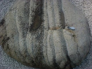 上の写真でルーペを置いた付近の拡大。ひとつの堆積サイクルを示す。黒雲母が右側に集まっていて、