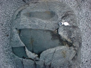 同様に、花崗岩に食い取られた捕獲岩。上の例よりも同化が進行している。