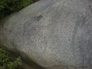 花崗岩中に入った幅3cmほどの脈。境界が明瞭な貫入関係に見えないので、完全に固結する前に、
