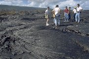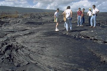 溶岩トンネルを踏み抜いたり、崩壊して落下する危険を説明している。しかし、溶岩流のすぐそばに寄れることがすごい。